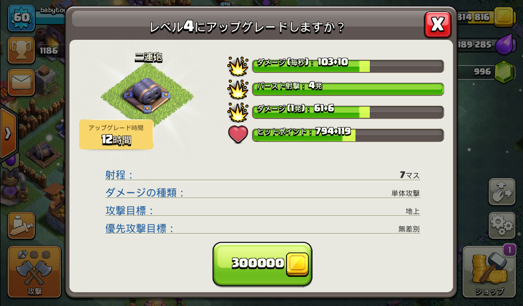大工の拠点の二連砲をレベル4にアップグレードしました。