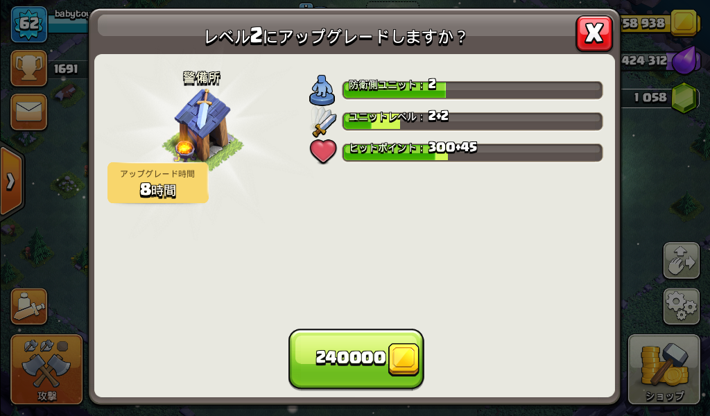 大工の拠点の警備所をレベル2にアップグレードしました。