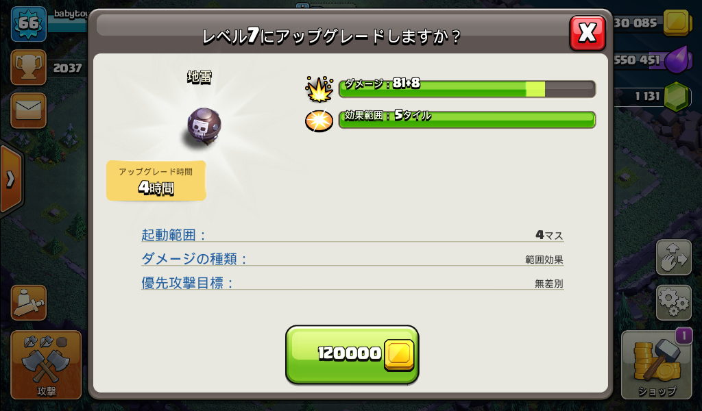 大工の拠点の地雷をレベル7にアップグレードしました。