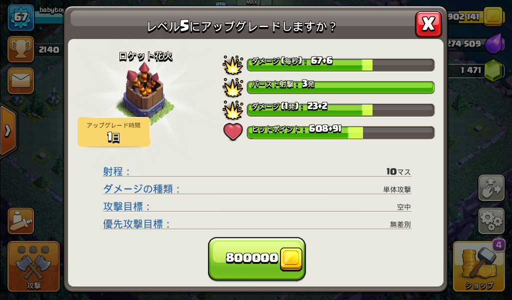 大工の拠点ではロケット花火をレベル5にアップグレードしました。