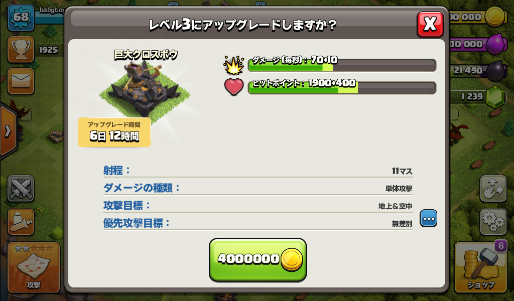 巨大クロスボウをレベル3にアップグレードしました。