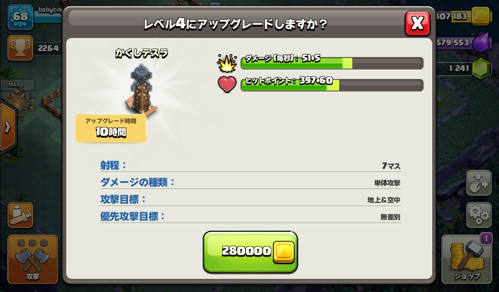 大工の拠点ではかくしテスラをレベル4にアップグレードしました。