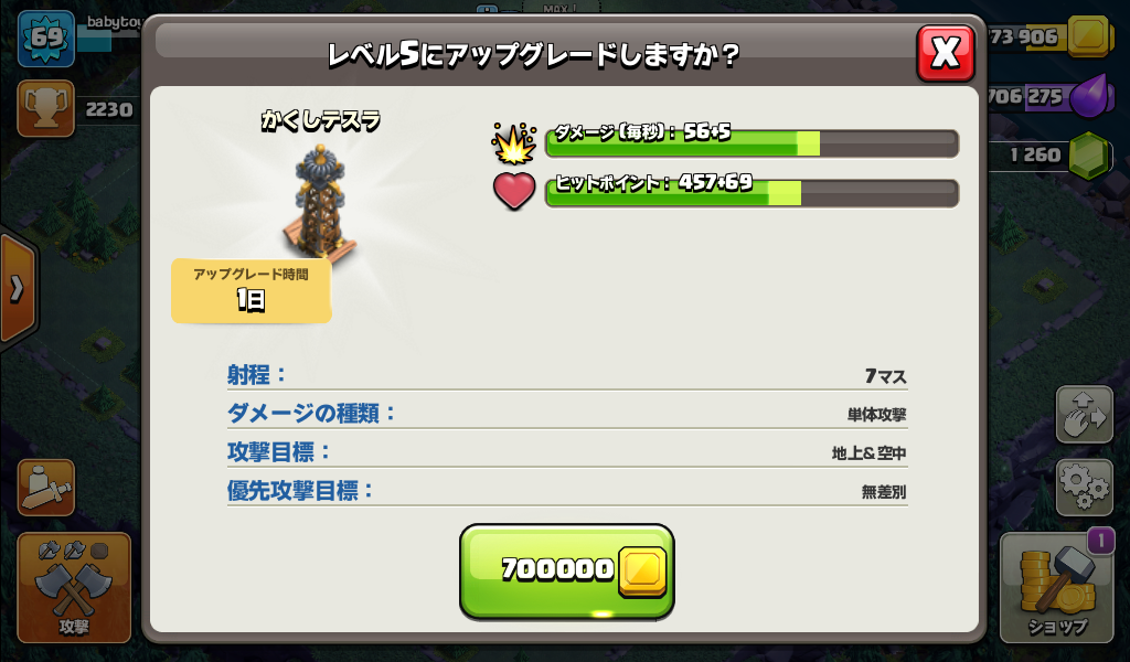 大工の拠点のかくしテスラをレベル5にアップグレードしました。