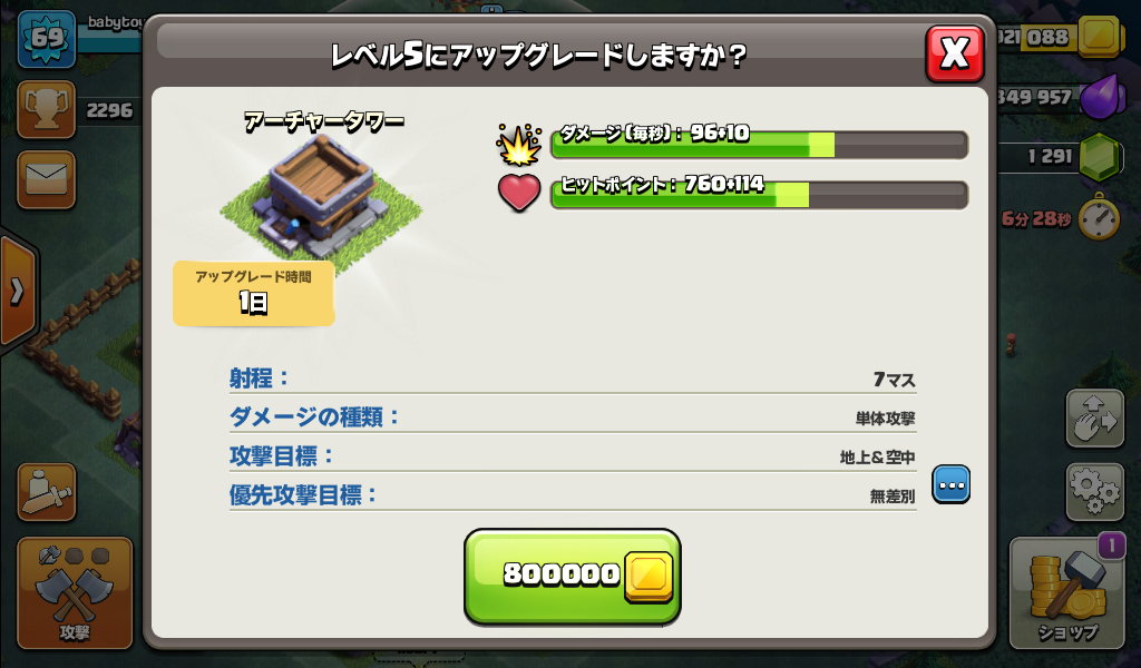 大工の拠点ではアーチャータワーをレベル5にアップグレードしました。