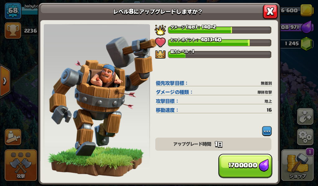 大工の拠点のバトルマシンをレベル8にアップグレードしました。